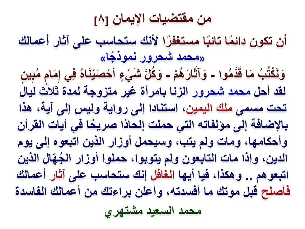 إن كل عمل يترك «آثارًا» حسنةً أو سيئةً بين الناس، سيتحمل الإنسان ثمرة آثاره في حياته أو بعد وفاته، والآثار السيئة هي التي تضل الناس، كمؤلفات «محمد شحرور»: