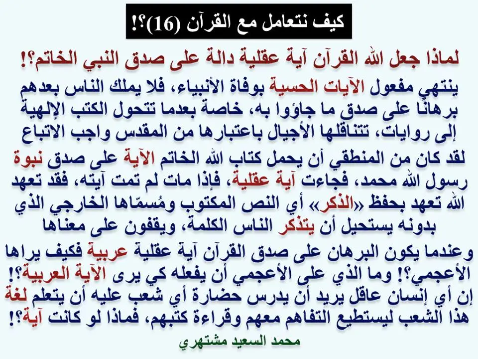 لقد كشفت معظم منشورات الصفحة منذ إنشائها، وما حملته من «منهجية علمية» قام عليها مشروعي الفكري، عن أزمة فكرية دينية، وعن مصيبة كبرى تُقام لها «سُرَادِقَات العزاء»، وهي الجهل بمفهوم «الآية الإلهية»، وموقف الناس منها، باعتبارها «قُرْآناً عَرَبِيّاً».